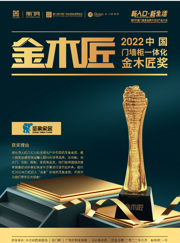 此次榮獲“2022中國門墻柜一體化金木匠獎”,不僅是行業(yè)和市場對圣象家居品牌的權威認可,更是圣象家居不斷向前的源泉和動力!未來,圣象家居繼續(xù)從設計出發(fā),為消費者提供綠色、智能家居整體解決方案,滿足消費者對家的美好向往。