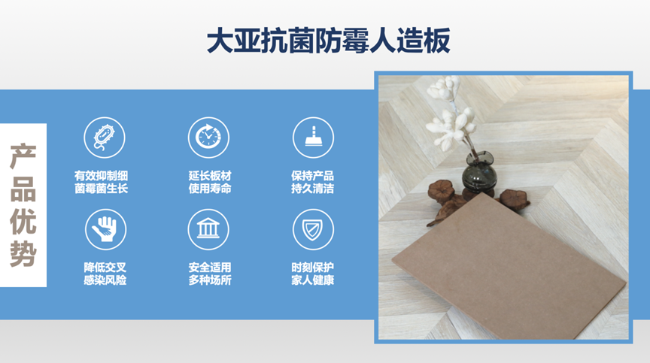 南方春季多雨,北方多沙塵,大家記得防霉抗菌,除了日常的清潔工作,也可以選擇具有防霉抗菌功能的家具,讓家潔凈溫馨。大亞人造板的抗菌防霉板能有效抑制霉菌的滋生,減少細(xì)菌對家具和人體的傷害,健康環(huán)保、舒適美觀。