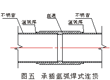①承插氬弧焊式連接(圖五),由配管插入管件承口,用鎢極氬弧焊(TIG)熔焊焊接成本體一色的通稱“無接頭連接”的連接方式。所謂承插式、焊接式都是管道常見的連接方式,創(chuàng)新的承插氬弧焊式管件和連接方式,是吸取傳統(tǒng)的承插式管道連接和焊接式管道連接兩者之長(zhǎng),并進(jìn)行有機(jī)的結(jié)合,以適應(yīng)不銹鋼良好的焊接性能。該鉅恒源管件承插口與管件本體用TIG焊接,且承插口設(shè)計(jì)有特殊的延伸邊,安裝施焊時(shí)以替代焊絲用,整個(gè)管件壁厚一般不低于同口徑配管的壁厚。另一種承插焊式管件,其承口采用擴(kuò)口方式加工,工藝簡(jiǎn)單,成本低,安裝施焊時(shí)需用焊絲(也有不用個(gè)案)等輔料,但目前僅≤DN50為多。