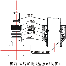 ①伸縮可撓式(圖四):配管插入管件承口,緊固內(nèi)螺母,通過擠壓環(huán)使密封圈受壓起密封作用的連接方式。