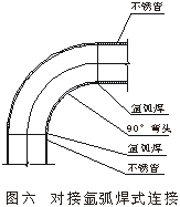 ② 對(duì)接氬弧焊連接,由配管與管件對(duì)接或配管間對(duì)接,用TIG焊熔焊焊接成“無接頭連接”的連接方式(圖六)。施焊過程均需焊絲或焊條,一般用于DN100以上管材,其壁厚相對(duì)較厚,配管端口應(yīng)先坡口,以TIG焊為好,如需多道施焊時(shí),也應(yīng)TIG焊打底,其余各層允許采用焊條電弧焊。