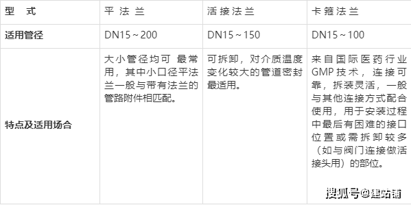 ④上述平法蘭、卡箍法蘭與配管連接采用氬弧焊(TIG)焊接。用活接法蘭,配管端口需預(yù)先翻邊。各種法蘭連接的適用范圍(見表二)。